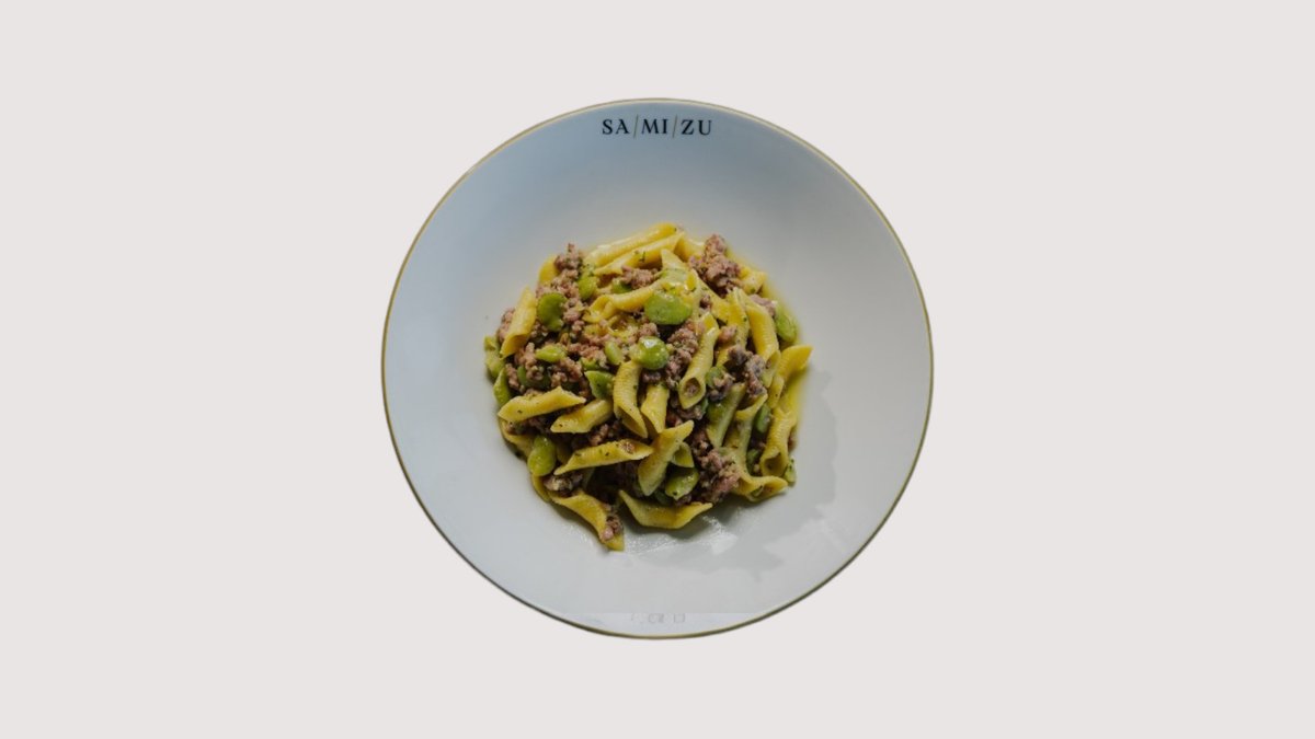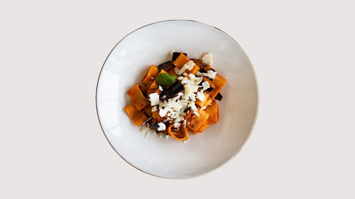 homemade paccheri , aubergine, marinara sauce, ricotta salata, garlic, basil, leeks