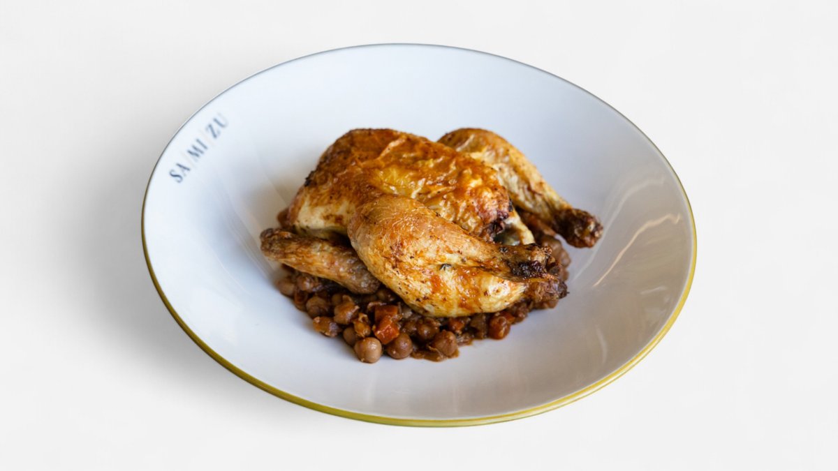 corn fed chicken, chickpeas , thyme, carrots, onions, fries