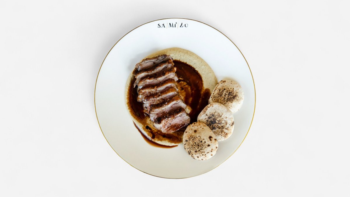 lamb saddle, charred aubergine, lemon puree, port jus, mini pita bread, miso, fries