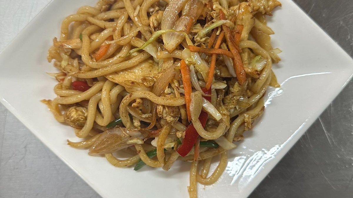 Chicken, noodles, eggs, cabbage, carrots, onions, peppers spring onion,sesame,, and soya