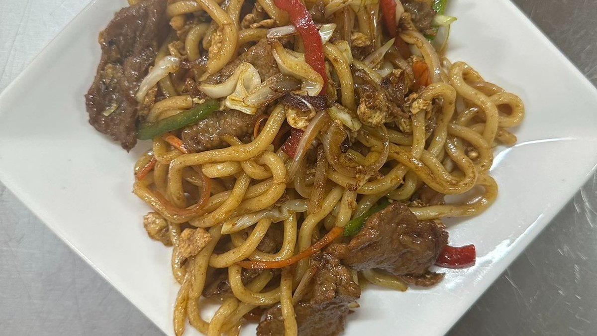 Beef, noodles, eggs, cabbage, carrots, onions, peppers spring onion,sesame,,and soya