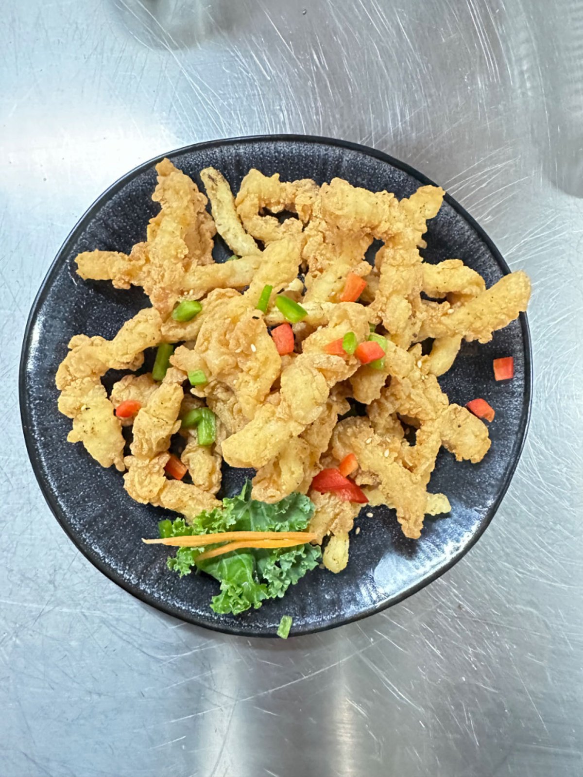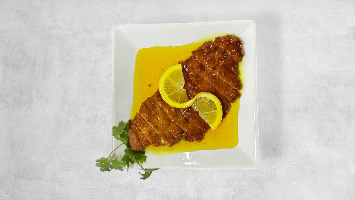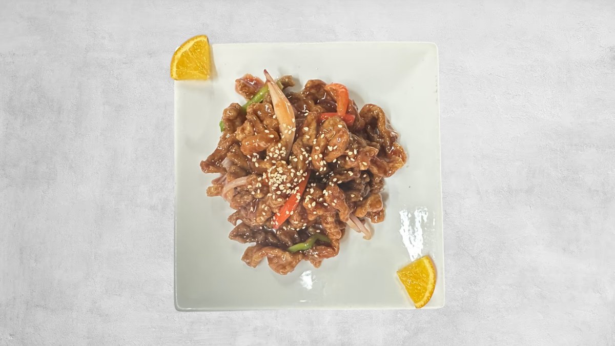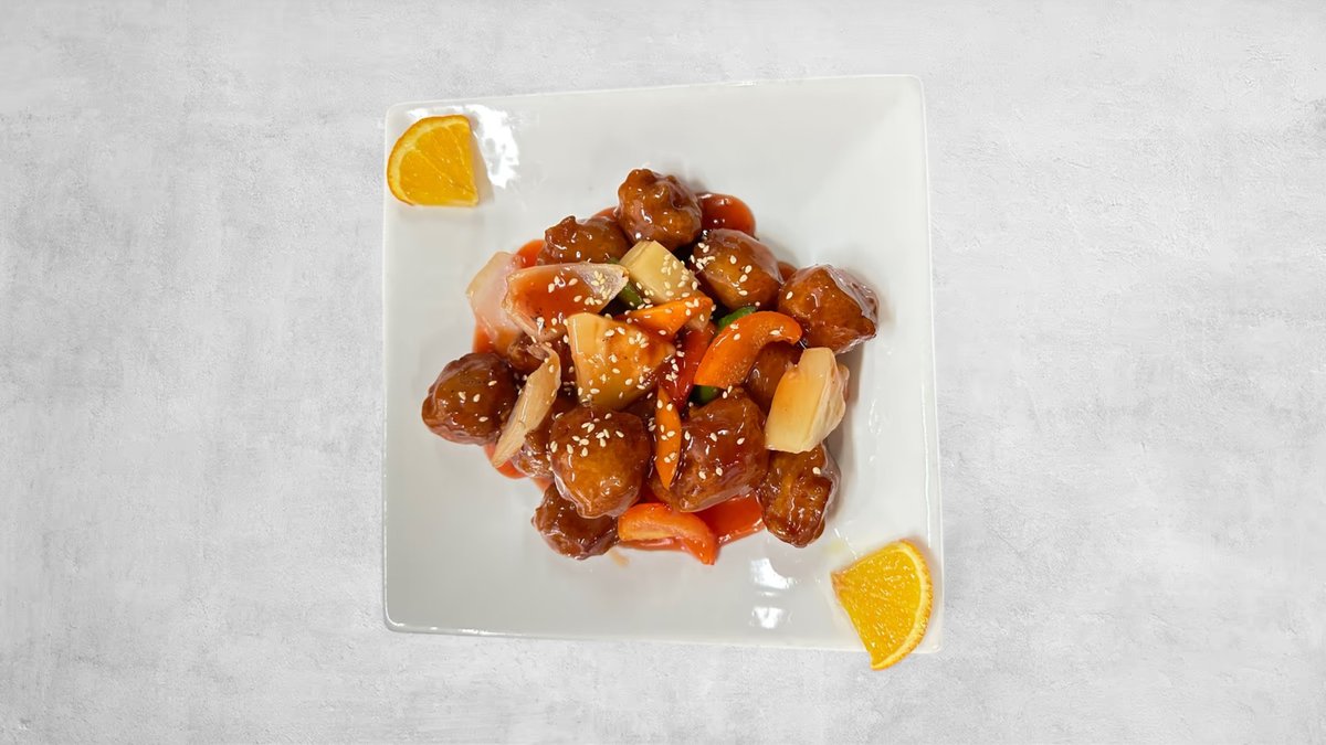 Deep fried chicken crumbs with batter, green and red peppers, carrots, onions sesame and pineapple