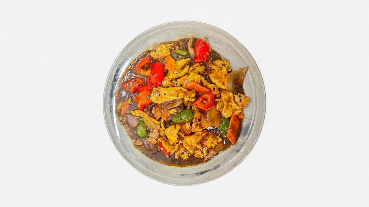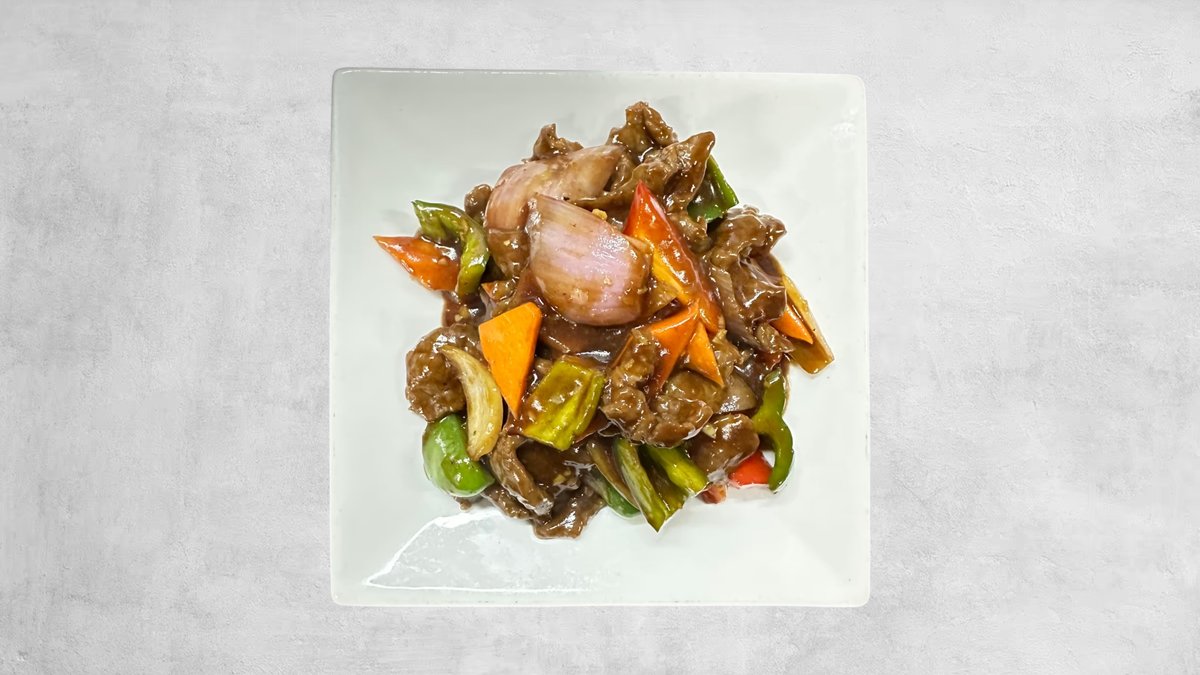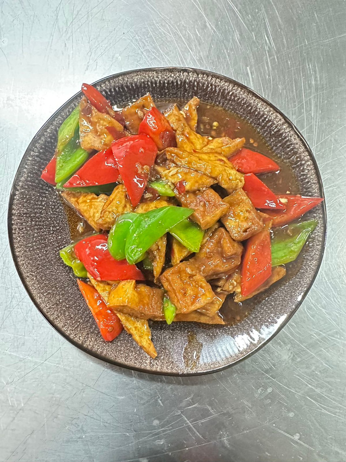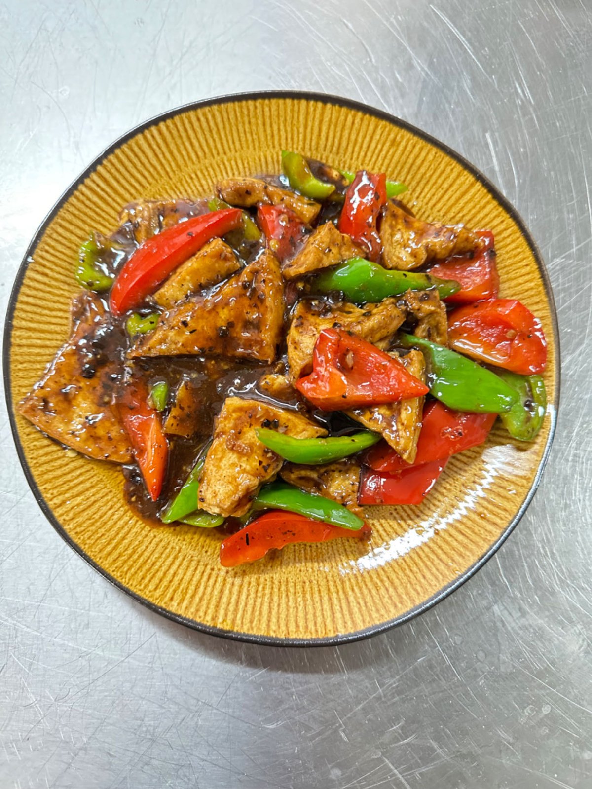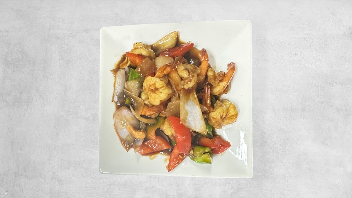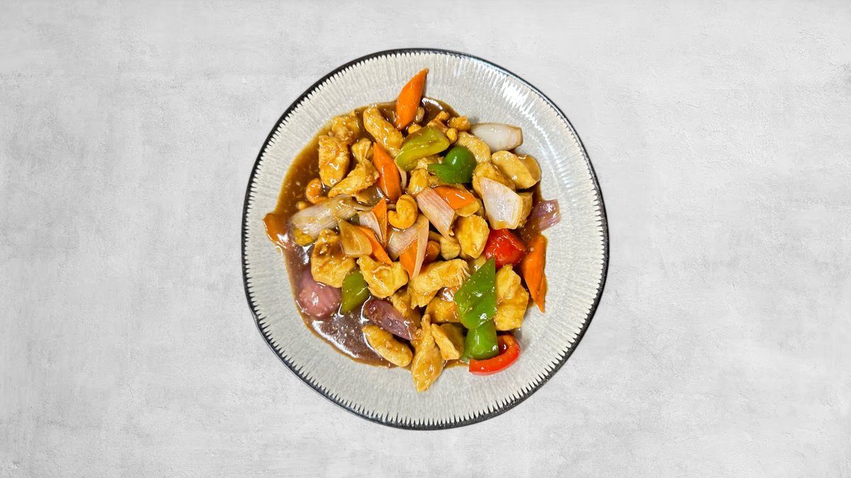 Chicken cubes, cashewnuts,green and colorful pepper, onion, carrots and beijing sauce