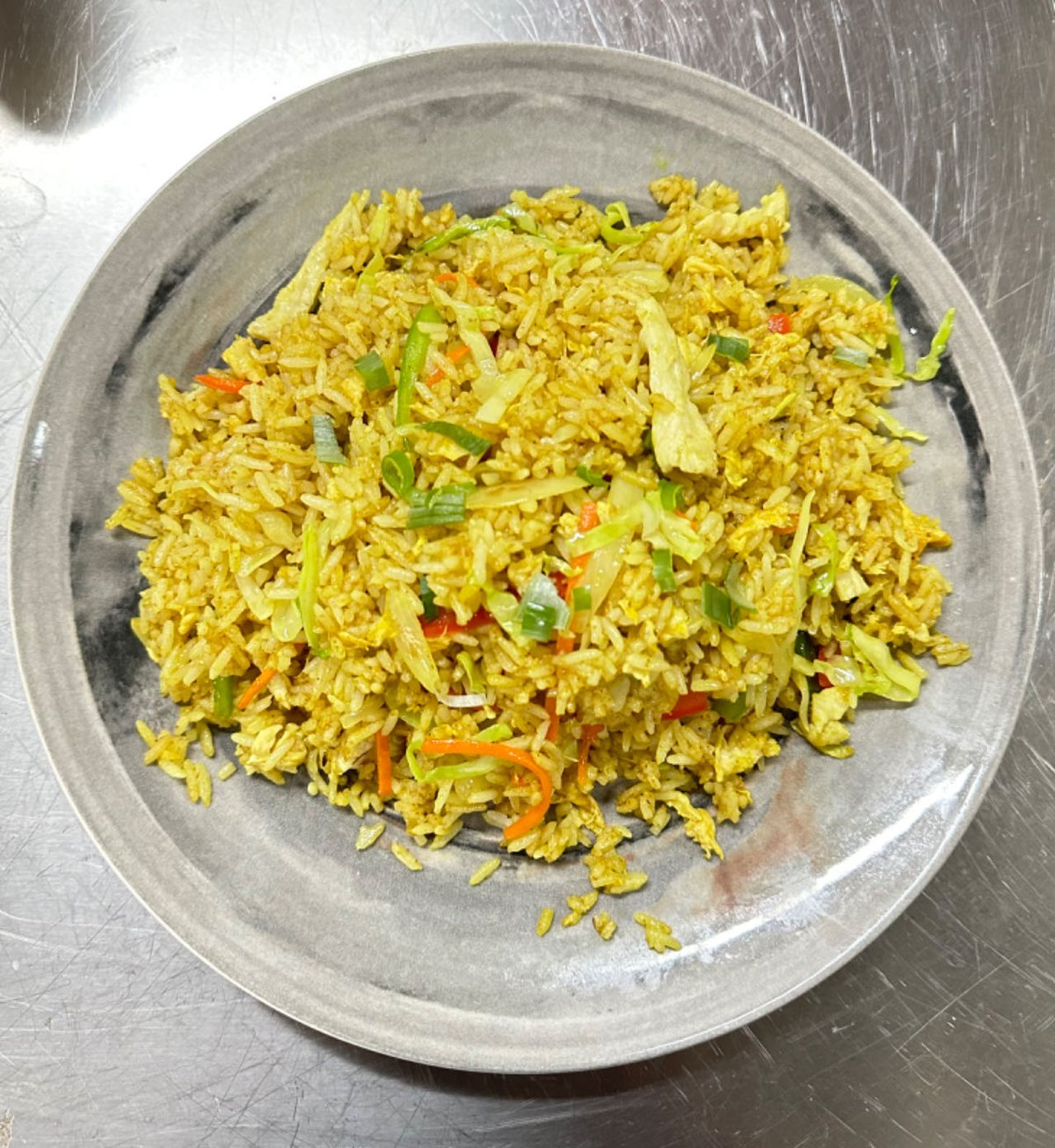 Chicken, white rice, cabbage, carrots, onions, peppers, spring onion, eggs and curry