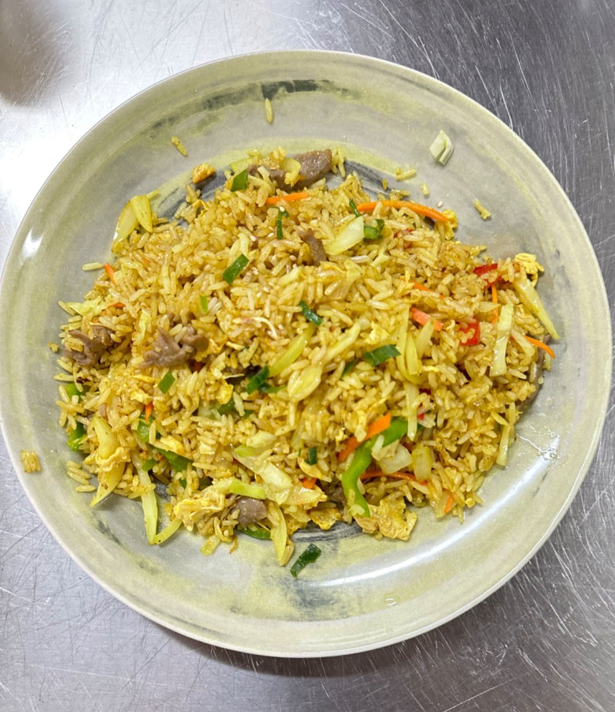 Beef, white rice, cabbage, carrots, onions, peppers, spring onion, eggs and curry