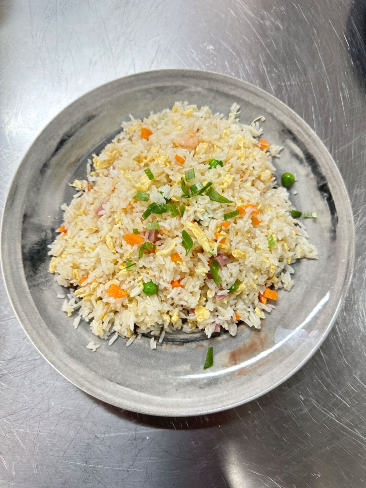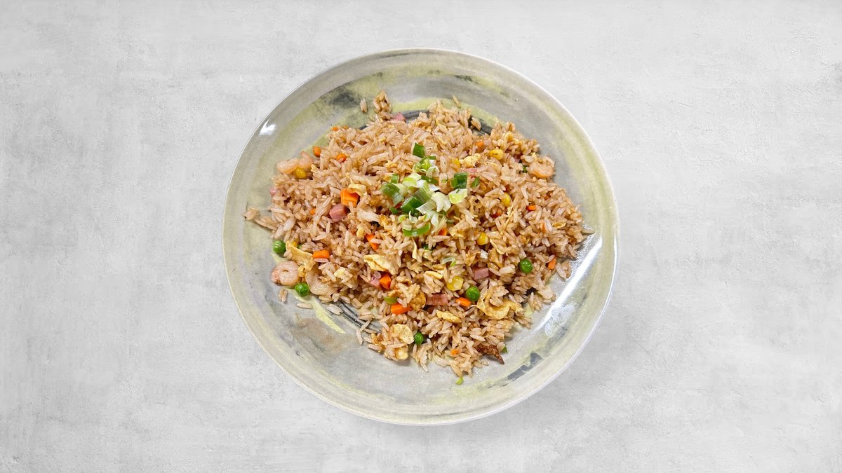 White rice, eggs, peas, carrots, shrimp, ham, sweet corn,spring onion, and soya