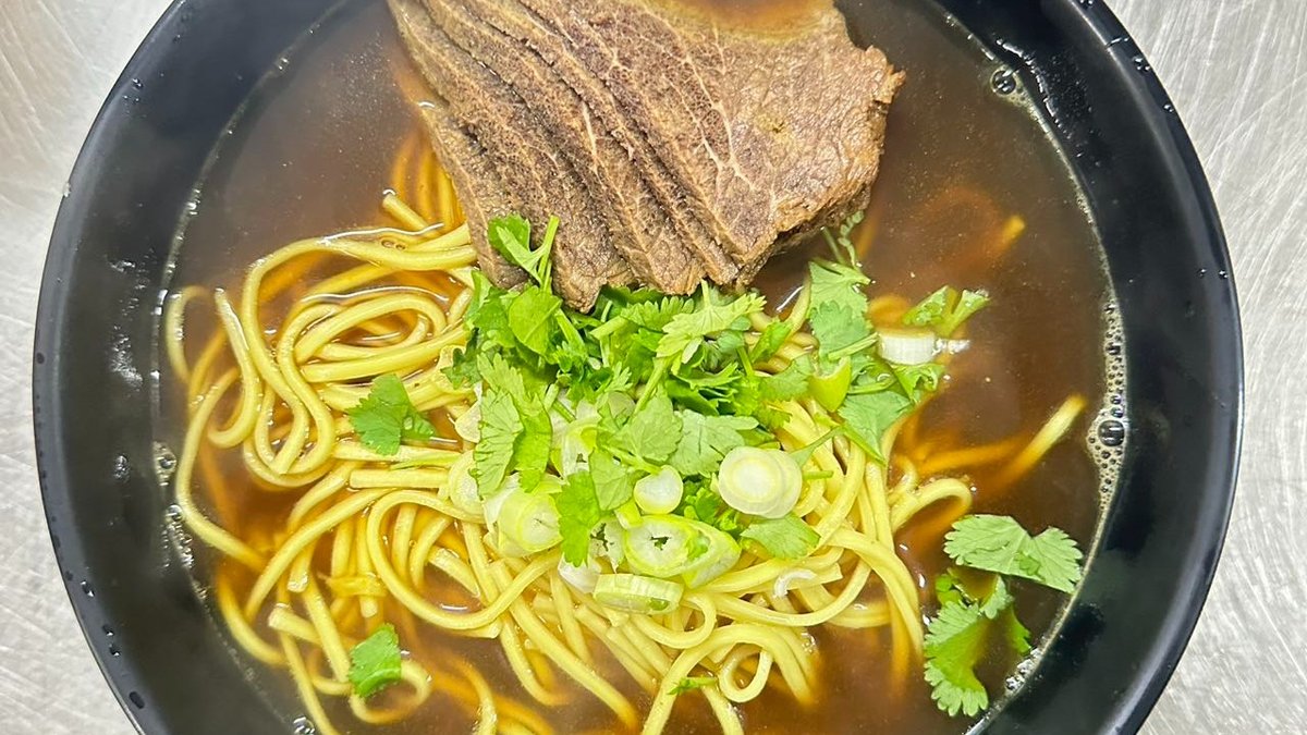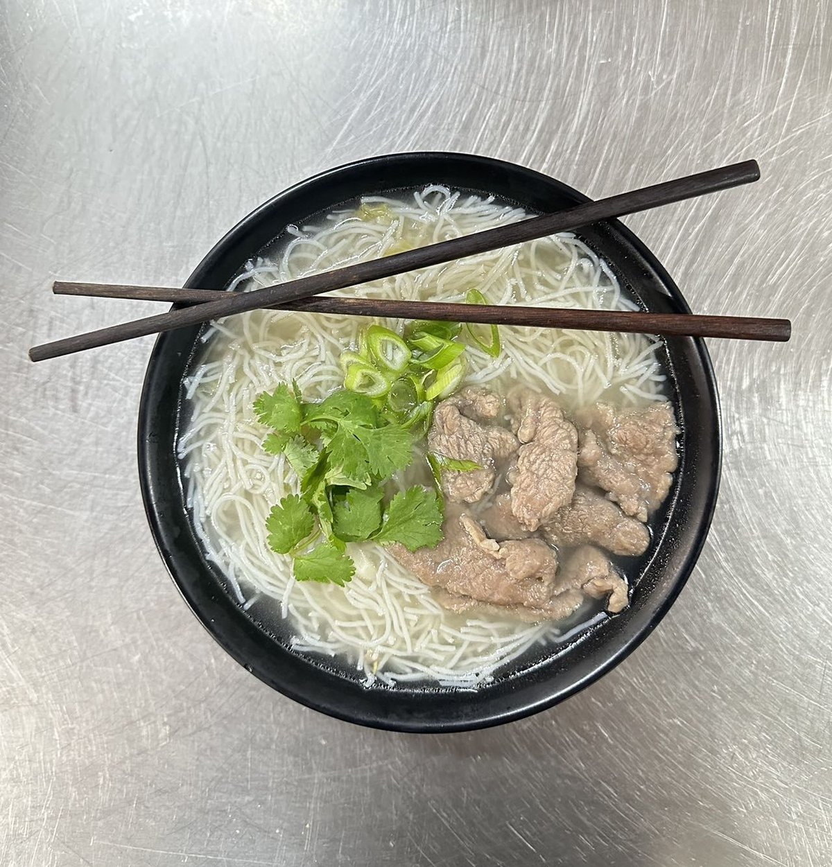 Beef, rice noodles, white pepper power, coriander, spring onion
