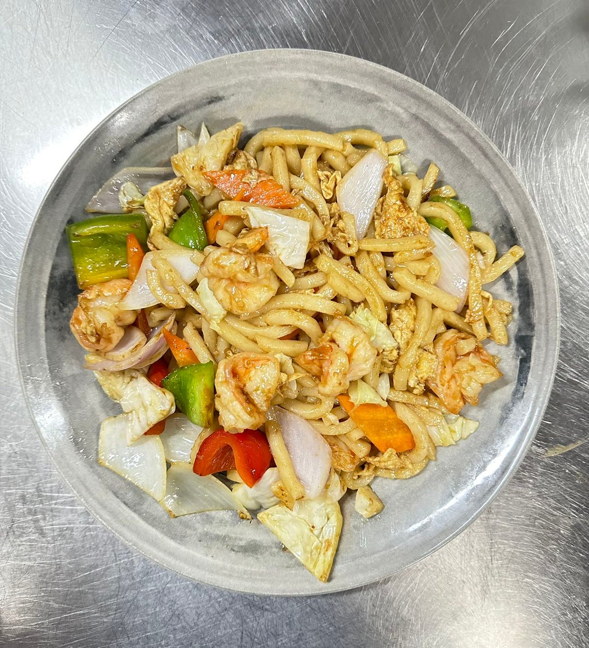 Udon noodles(200g), eggs, cabbage, carrots, onions, peppers , spring onion, sesame, oyster and soya