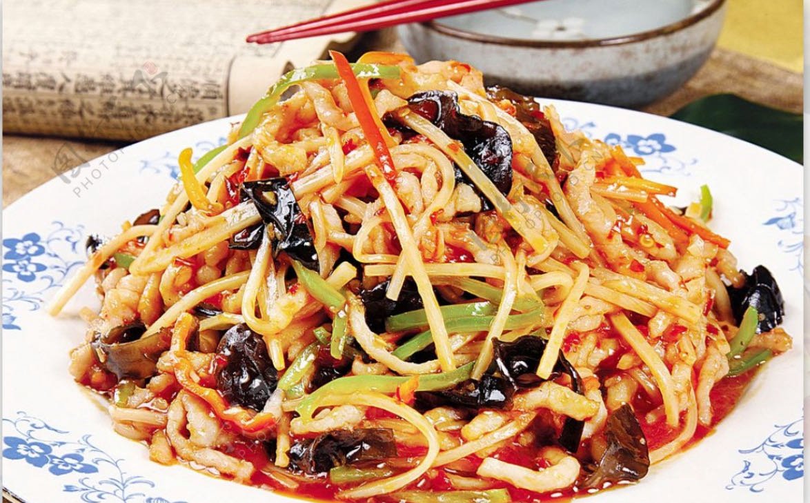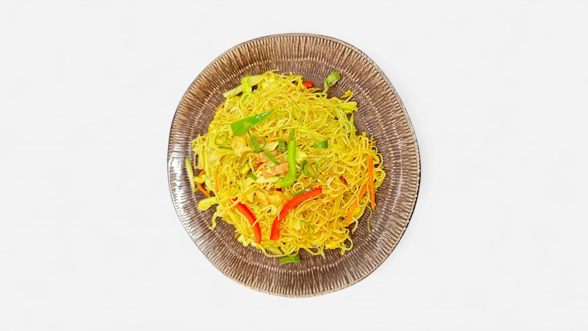 Vermicelli, carrots, onions, peppers, cabbage, curry, eggs, spring onion,sesame,shrimp and ham