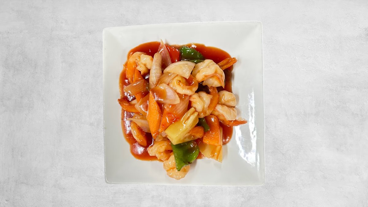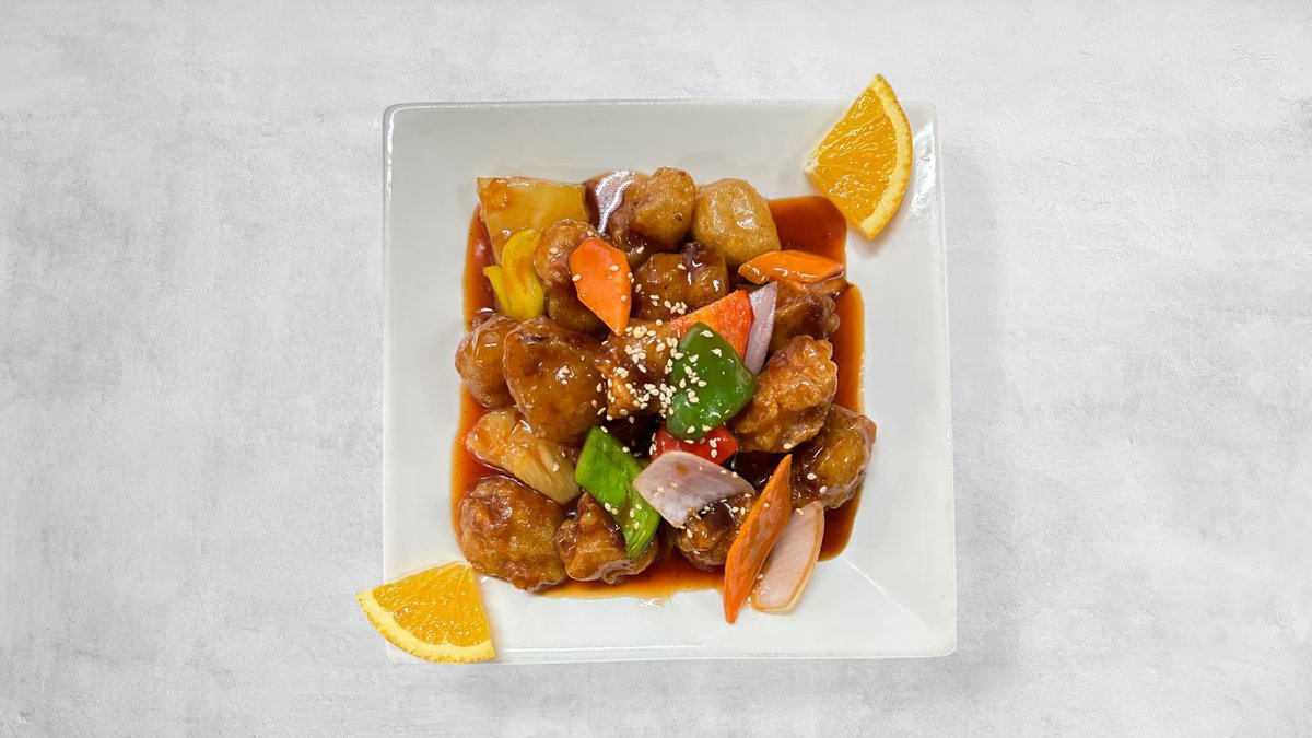 Deep fried pork fillet crumbs with batter, green and red peppers, carrots, onions sesame and pineapple