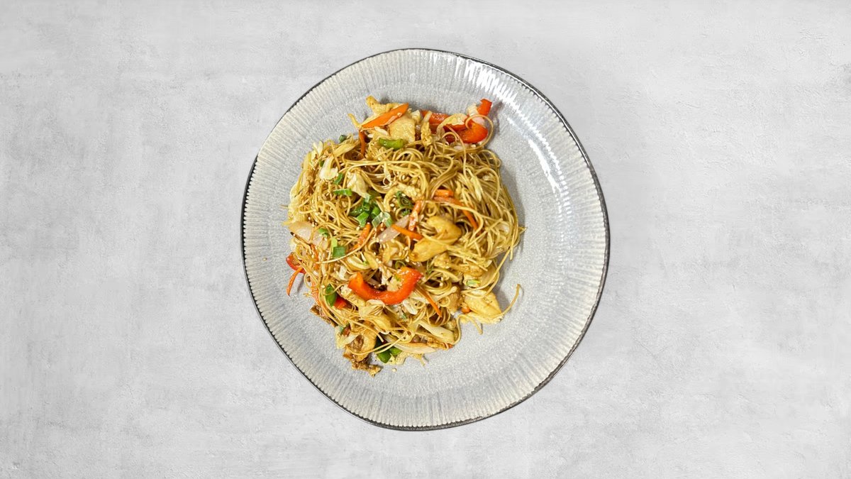 Vermicelli, chicken, eggs, carrots, onions, sweet pepper, cabbage, spring onion, sesame, and soya