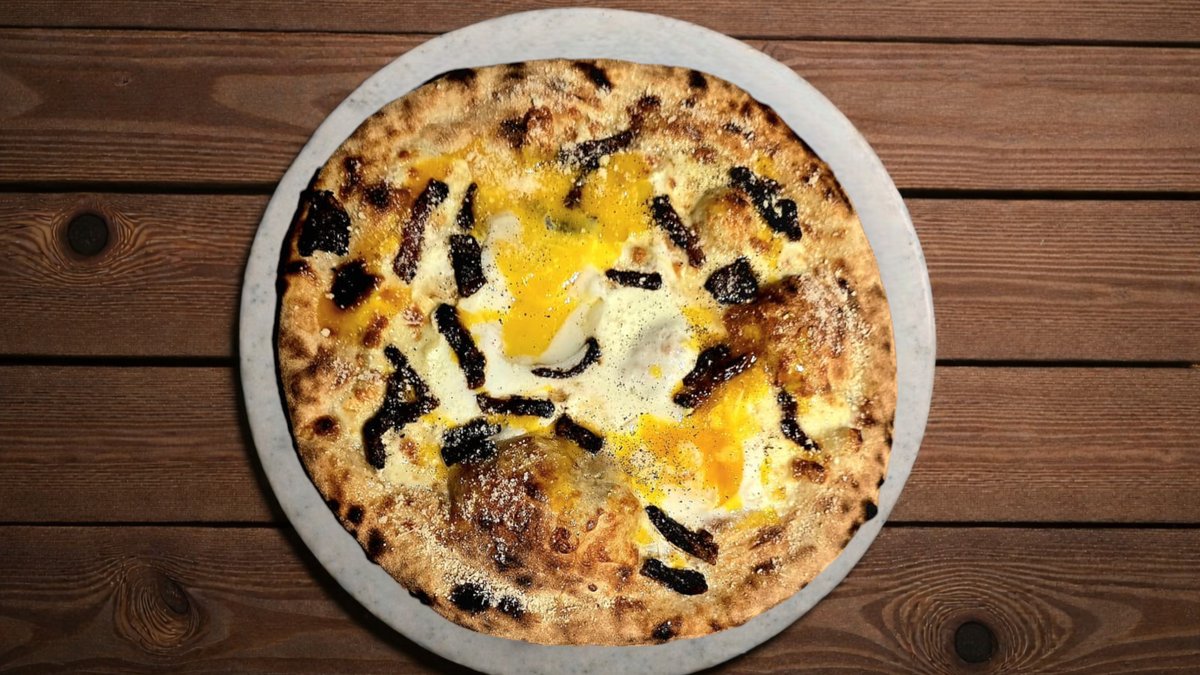 Crispy guanciale, pecorino cheese, eggs with sprinkle of black pepper, mozzarella and a drizzle of olive oil.