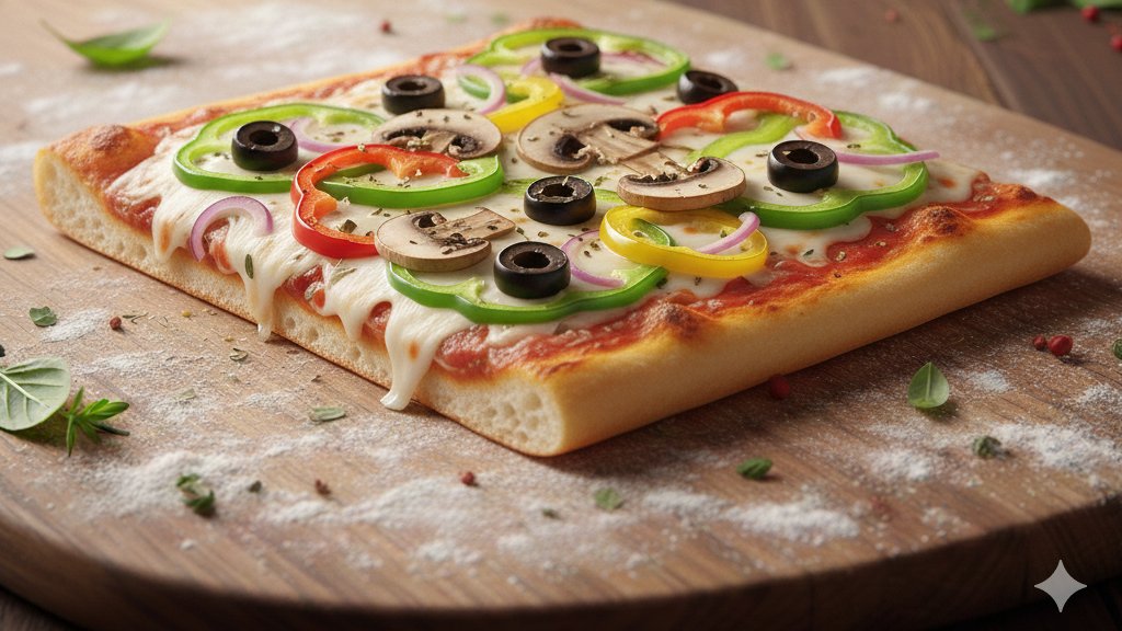Packed with bell peppers, onions, mushrooms, olives, Tomato sauce and mozzarella cheese and a drizzle of olive oil and oregano.