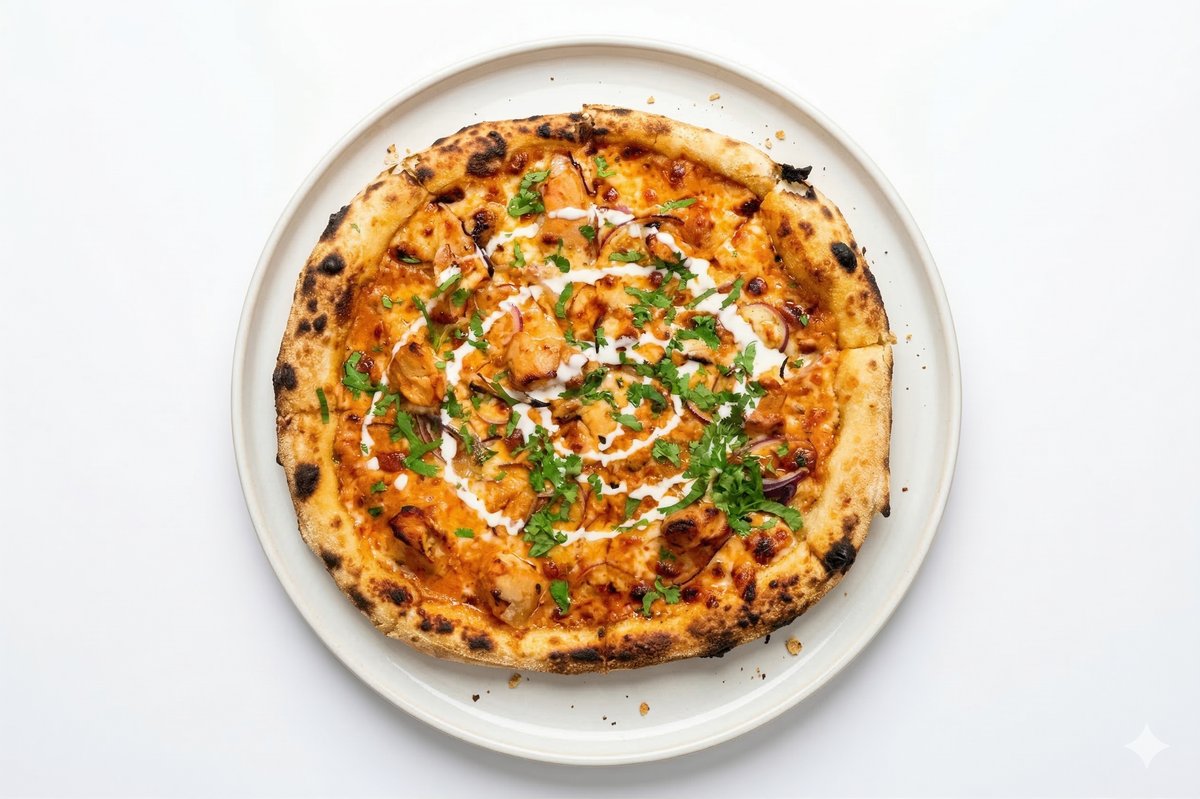 Tomato and Onion Smooth Gravy with Indian Spices and butter, Mozzarella, Tender Chicken, Onions, Garlic oil, Coriander Leaves on Top.