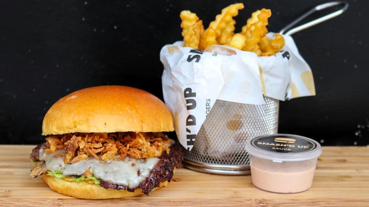 Includes two Smash’d Up burgers — each stacked with a juicy beef patty, crispy lettuce, melted cheddar, crispy onion, and your choice of sauce. The ultimate lunch for serious hunger or the perfect shareable deal.