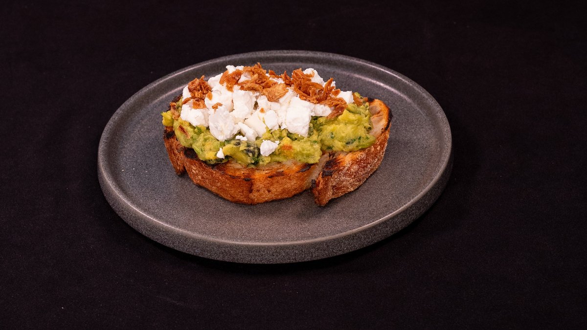 SMASHED AVOCADO, FETA CHEESE, CRISPY ONIONS ON LOCAL BREAD