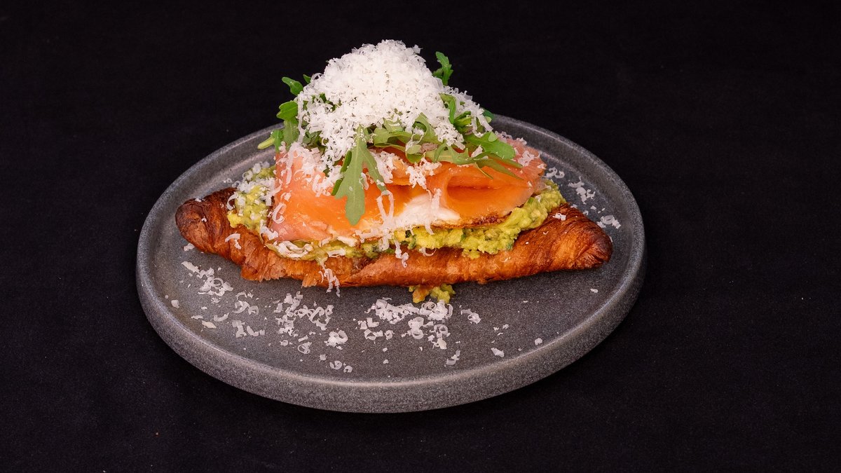 FRIED EGG, SMASHED AVOCADO, SMOKED SALMON, RUCOLA, GRANA PADANO, SERVED ON A FLAT CROISSANT