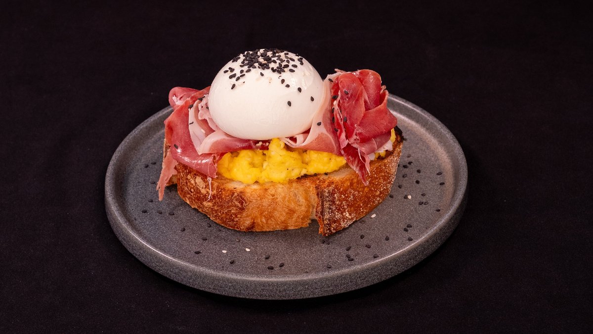 SCRAMBLED EGGS, BURRATA CHEESE, PARMA HAM, SESAME SEEDS ON LOCAL BREAD
