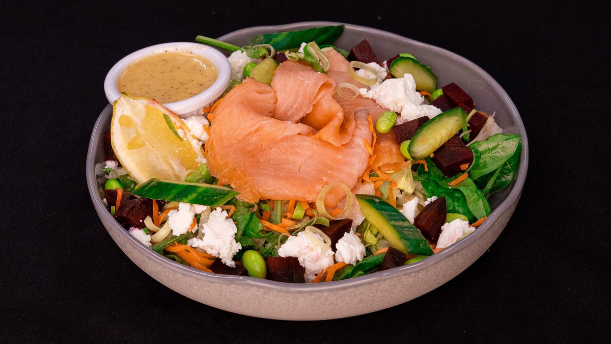 SMOKED SALMON, MIX GREENS, CARROTS, RICOTTA CHEESE, BEETROOT, EDAMAME BEANS, SPRING ONIONS, HONEY & GRAIN MUSTARD DIP