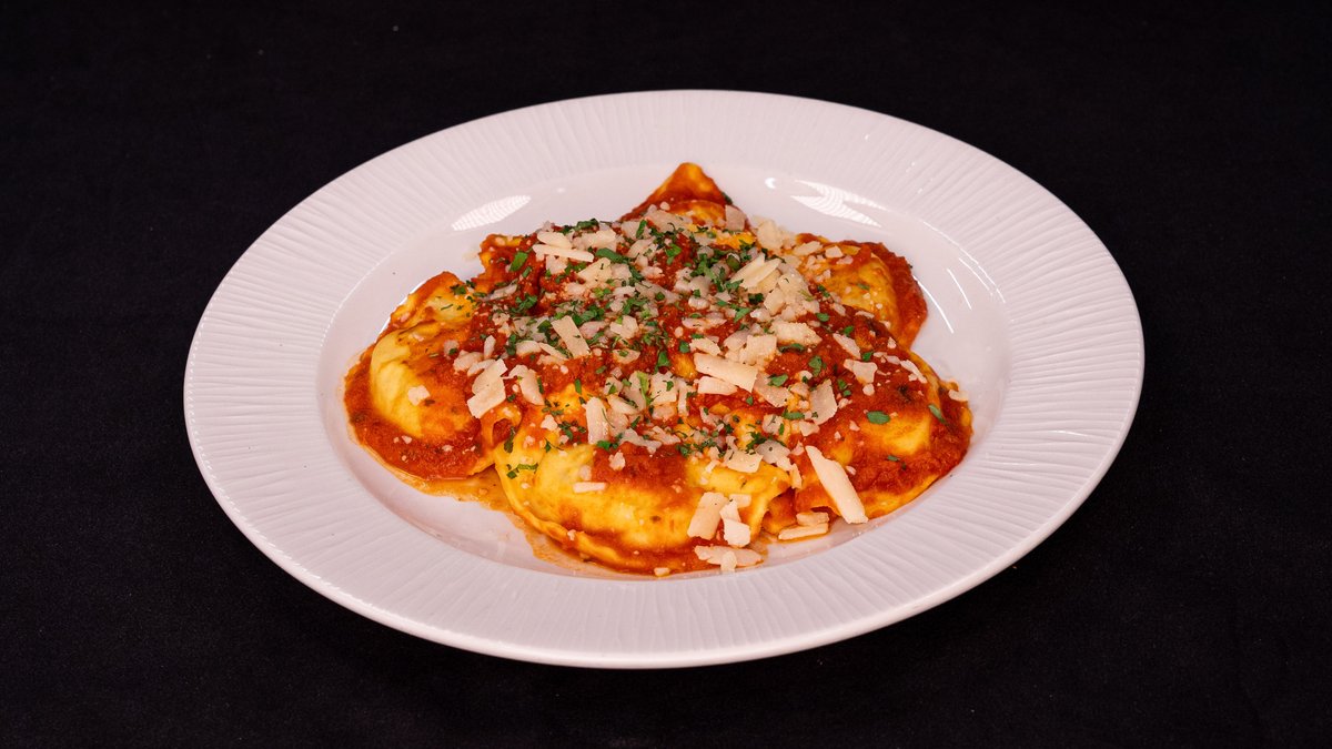 A DOZEN RICOTTA RAVIOLI, TOMATO SAUCE, GRANA PADANO SHAVINGS, PARSLEY