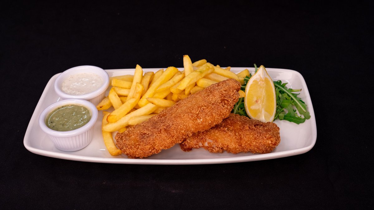 BATTERED HOMESTYLE FISH, MUSHY PEAS, TARTAR SAUCE WITH FRIES