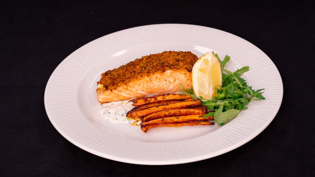 SALMON FILLET WITH SUNDRIED TOMATO & PARSLEY CRUST, CREAM CHEESE, LEMON DILL CREAM, WITH HONEY GLAZED CARROTS & FRIES