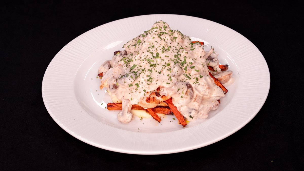 LOCAL CHICKEN BREAST FLAMED IN BRANDY, MUSHROOMS, SWEET CIDER, CREAM WITH HONEY GLAZED CARROTS & FRIES
