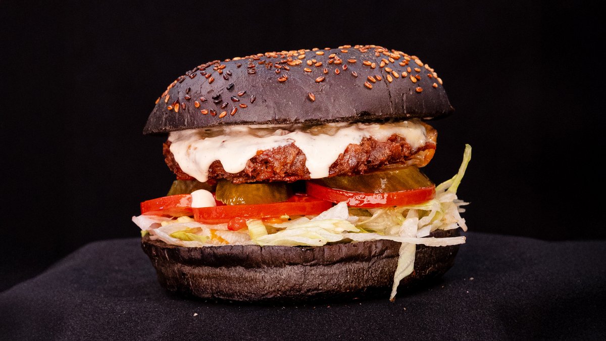 BEYOND BURGER, RAW ONIONS, LETTUCE, TOMATO, GHERKINS, VEGAN MOZZARELLA, HOME-MADE VEGAN RELISH, TOASTED CHARCOAL BUN WITH FRIES