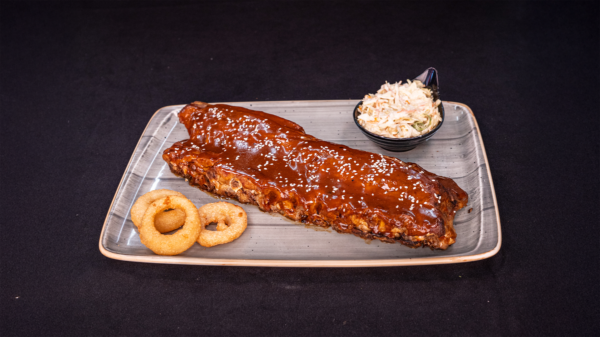 FULL RACK OR SMOKEY RUBBED PORK RIBS, HOME-MADE BBQ SAUCE, COLESLAW, BATTERED ONION RINGS WITH FRIES
