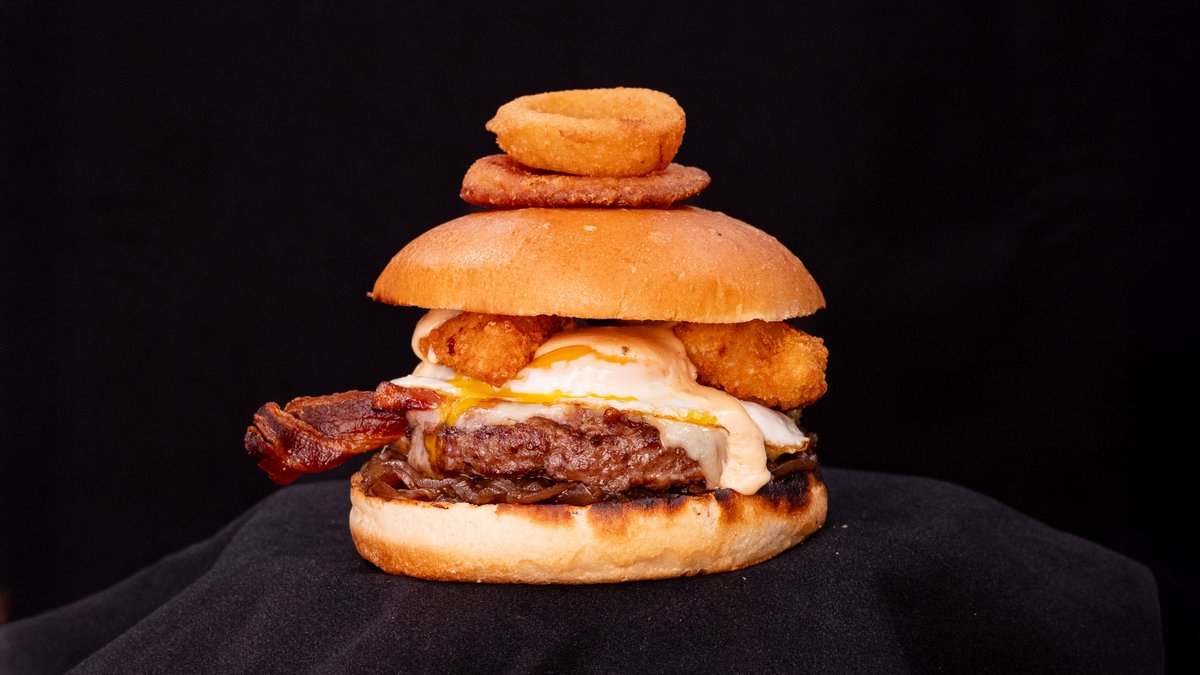 200G BEEF BURGER PATTIE, CHEDDAR CHEESE, FRIED EGG, CARAMALISED ONIONS, CRISPY CHICKEN BITE, BEER BATTERED ONION RINGS, HOME-MADE RELISH, TOASTED BRIOCHE BUN WITH FRIES