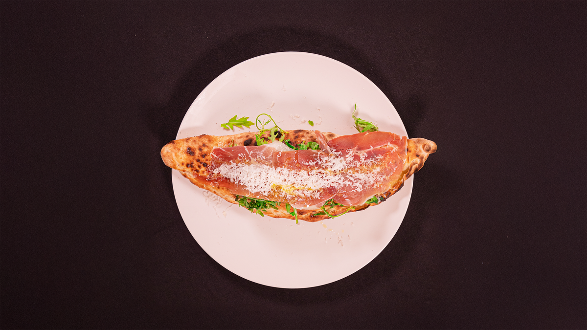CLOSED PIZZA, MOZZARELLA FIOR DI LATTE, GARLIC TRUFFLE CREAM CHEESE, MUSHROOMS, RUCOLA, GRANA, PARMA HAM