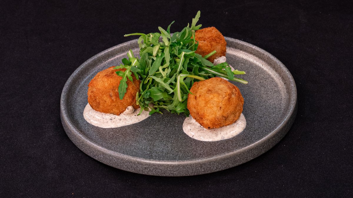 3 BREADED FRIED RICE BALLS FILLED WITH TRUFFLED MUSHROOMS & MOZZARELLA, TRUFFLE MAYO DIP