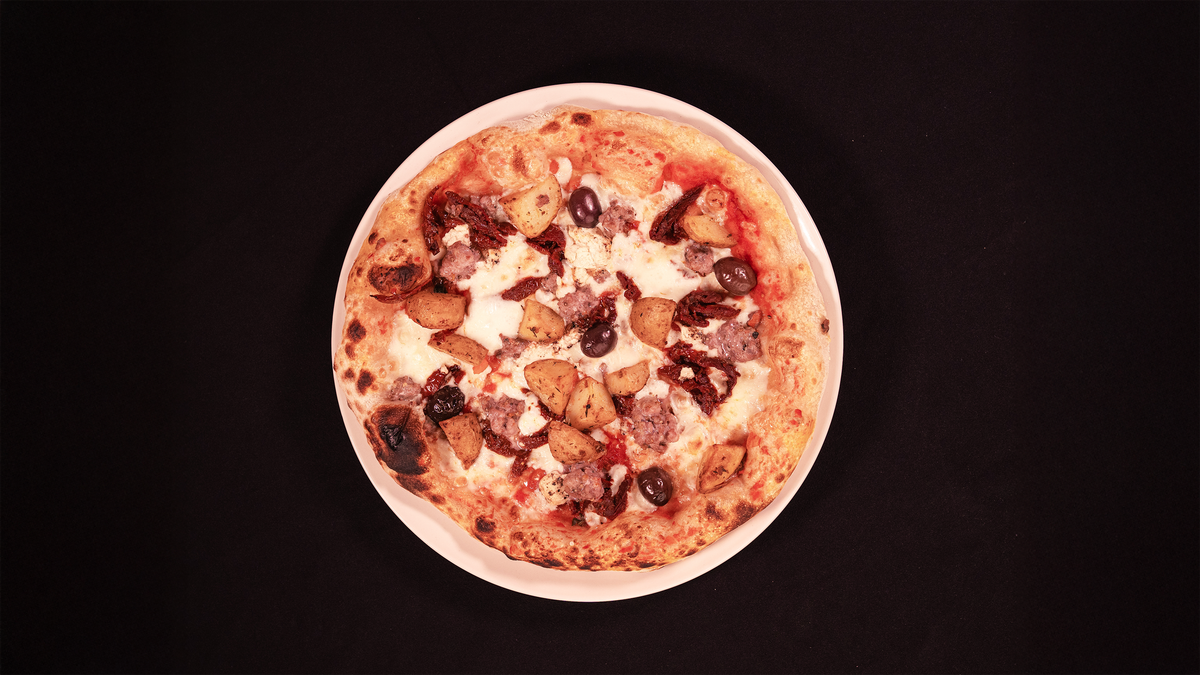 SAN MARZANO TOMATO SAUCE, MOZZARELLA FIOR DI LATTE, PEPPERED GOAT CHEESE, MALTESE SAUSAGE, POTATOES, SUNDRIED TOMATOES, BLACK OLIVES