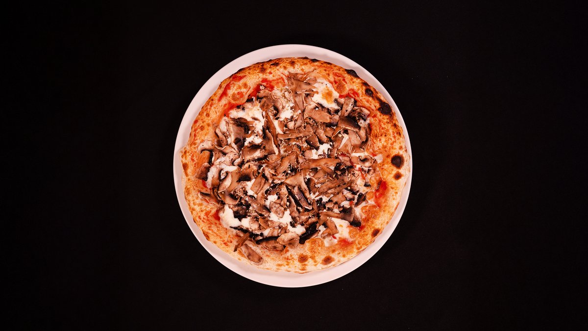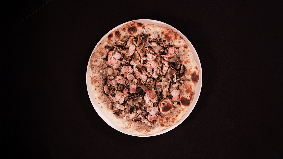 MOZZARELLA FIOR DI LATTE, TRUFFLE PASTE, MUSHROOMS, BACON, GARLIC OIL, OREGANO