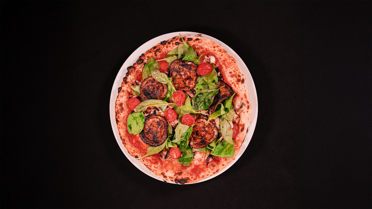 SAN MARZANO TOMATO SAUCE, VEGAN MOZZARELLA BABY SPINACH, CHERRY TOMATOES, MUSHROOMS, AUBERGINES, BASIL, OLIVE OIL