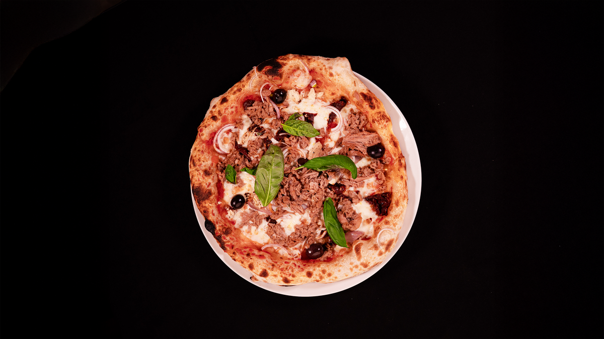 SAN MARZANO TOMATO SAUCE, MOZZARELLA FIOR DI LATTE, TUNA, BLACK OLIVES, PEPPERED GOAT CHEESE, ONIONS, BASIL, SUNDRIED TOMATOES