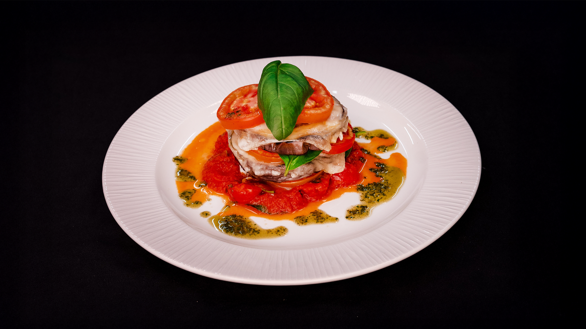 GRILLED LAYERS OF AUBERGINES, VEGAN MOZZARELLA, TOMATO SLICES, PISTACCHIO PESTO, TOMATO SAUCE WITH FRIES
