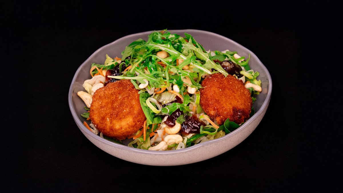 BREADED & SEEDED LOCAL GOAT CHEESE, MIX GREENS, SPRING ONIONS, CARROTS, CASHEW NUTS, HOME-MADE TOMATO & ONION CHUTNEY