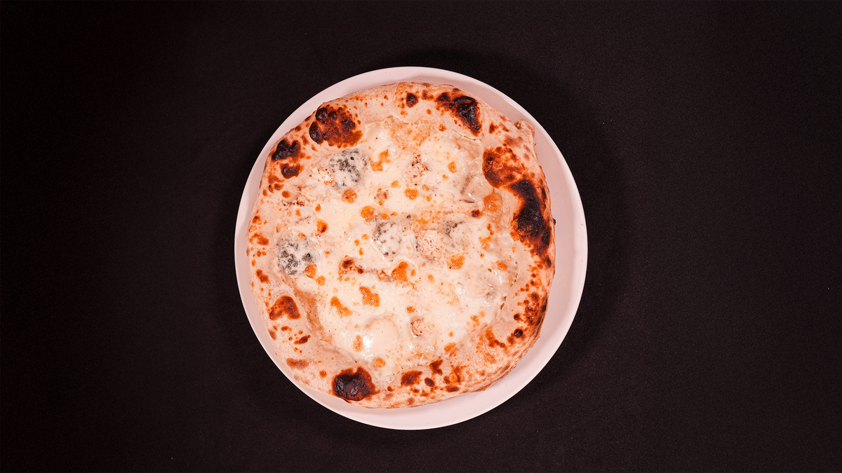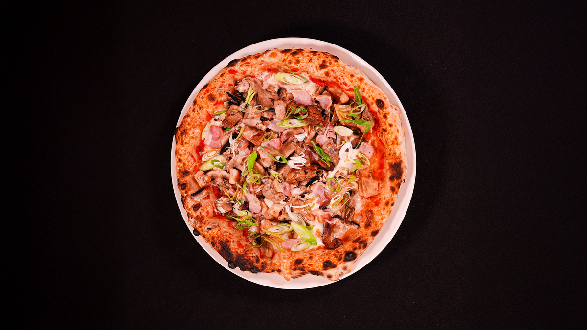 SAN MARZANO TOMATO SAUCE, MOZZARELLA FIOR DI LATTE, GRILLED CHICKEN, BACON, MUSHROOMS, SPRING ONIONS