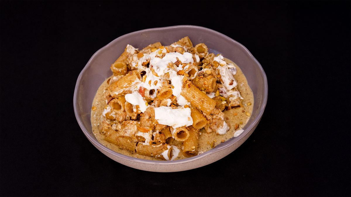 RIGATONI, CHICKEN, PANCETTA, PISTACCHIO PESTO, GRANA CHEESE, CREAM, STRACCIATELLA, PISTACCHIO DUST