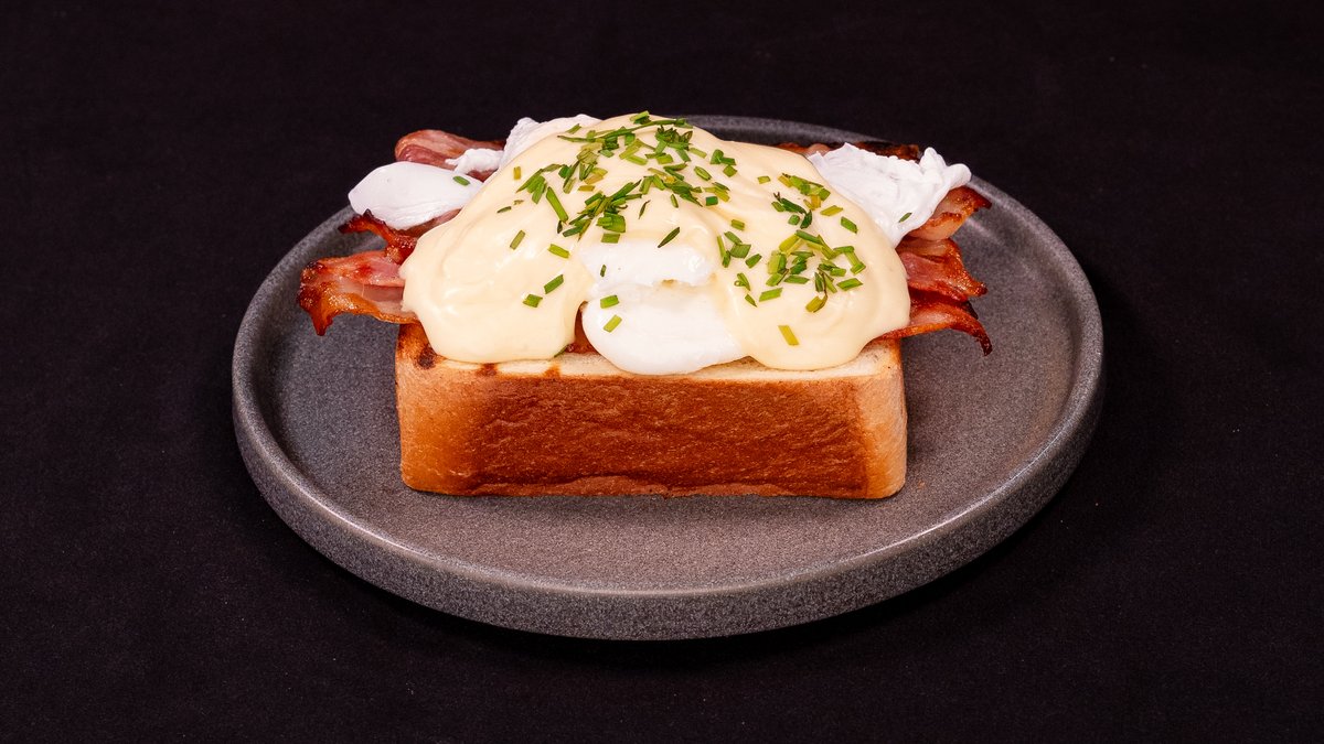 BRIOCHE BREAD, POACHED EGGS, GRILLED STREAKY BACON, CHIVES, HOLLANDAISE SAUCE