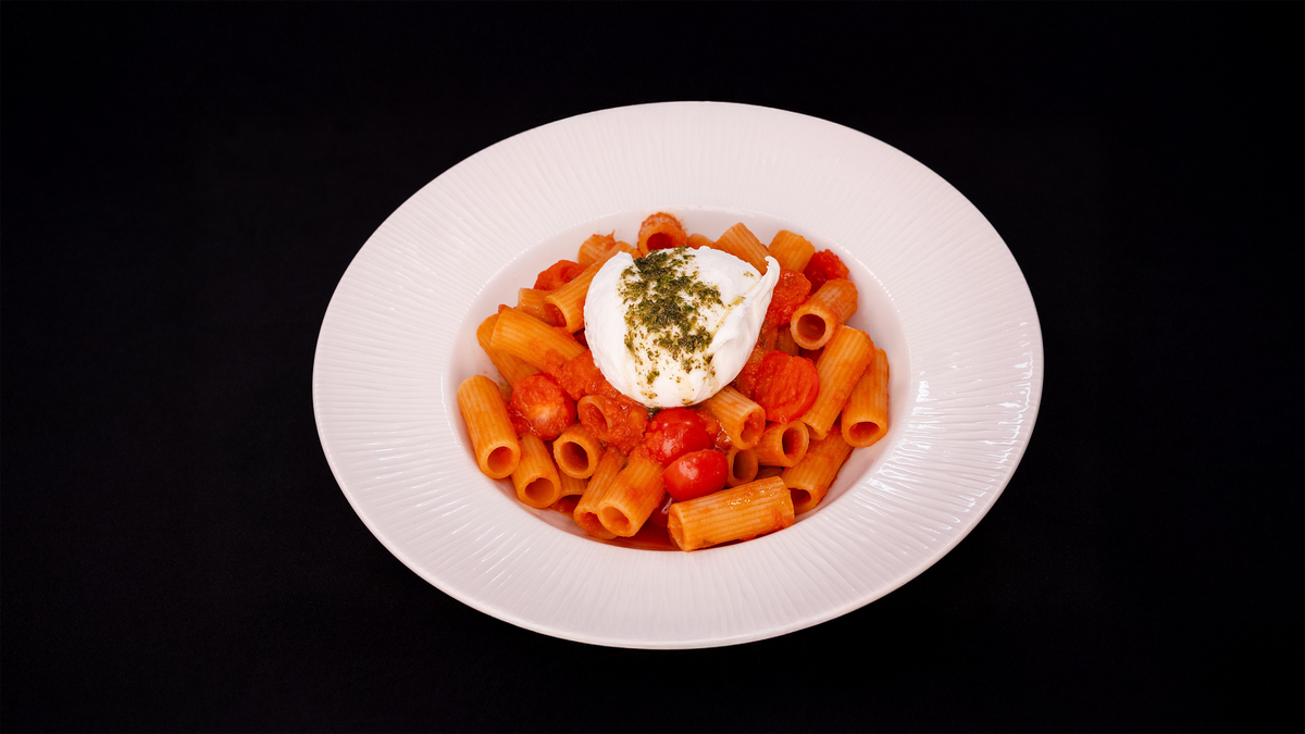 RIGATONI, TOMATO SAUCE, CHERRY TOMATOES, BURRATA, OLIVE OIL