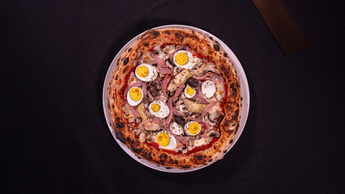 SAN MARZANO TOMATO SAUCE, MOZZARELLA FIOR DI LATTE, PROSCIUTTO COTTO, MUSHROOMS, EGG, ARTICHOKES, BLACKOLIVES, OREGANO