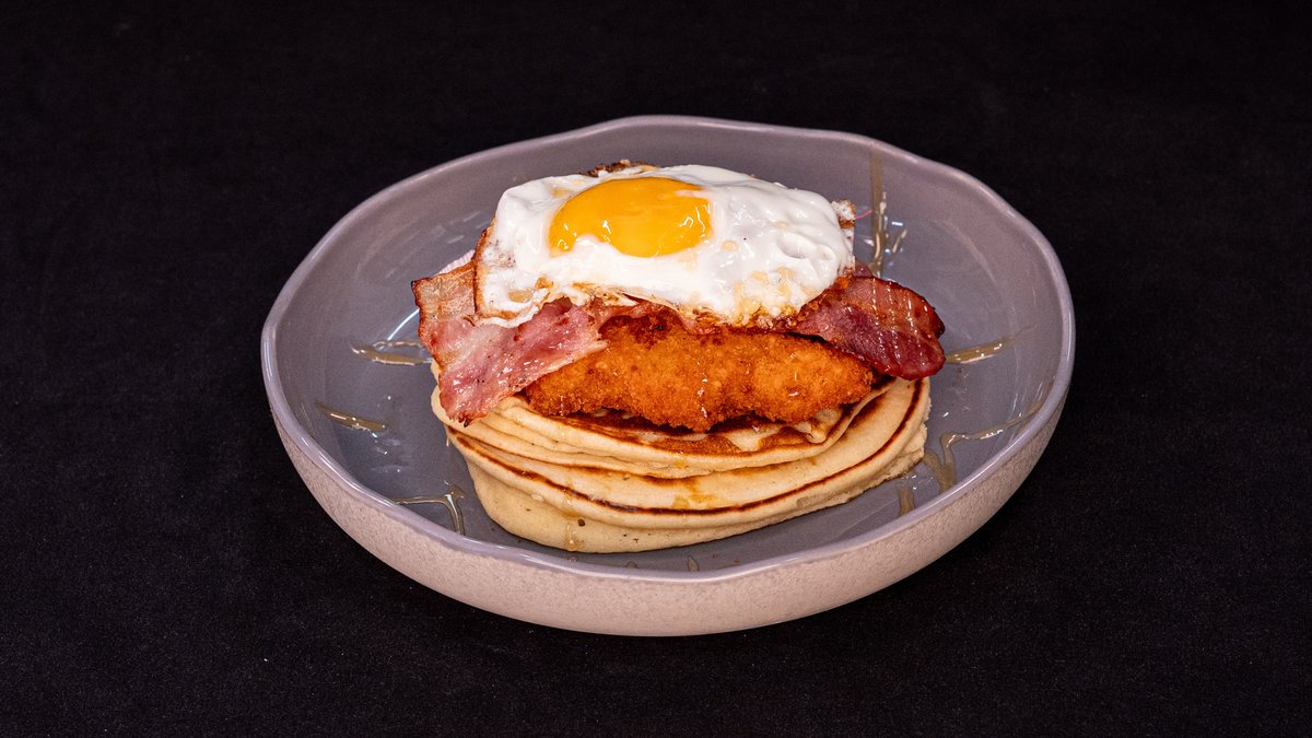 LAYERS OF 2 FLUFFY HOMEMADE PANCAKES, FRIED CHICKEN, GRILLED STREAKY BACON, FRIED EGG, MAPLE SYRUP