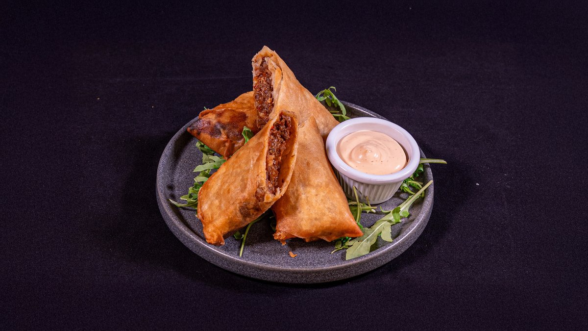 CHILI CON CARNE, MATURE CHEESE, CARAMALISED ONIONS, WRAPPED IN PASTRY, SPICY MAYO DIP