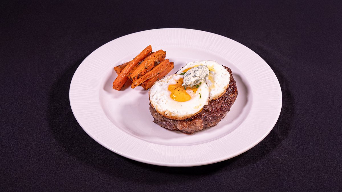 300G GRILLED BEEF RIBEYE STEAK, 2 FRIED EGGS, GARLIC PARSLEY BUTTER WITH HONEY GLAZED CARROTS & FRIES