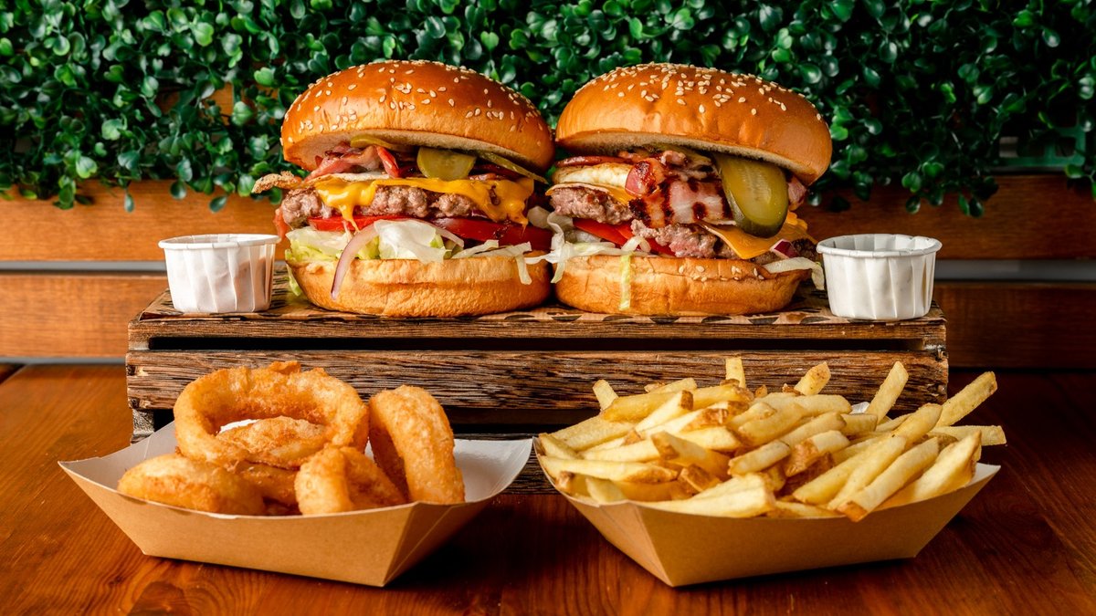 2 cheese burgers, 2 fries and 1 portion of beer-battered onion rings served with 2 dips of your choice