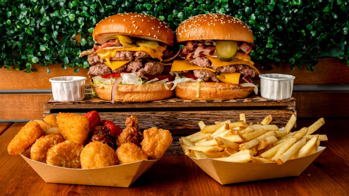 2 Burgers and dough burgers, 2 fries and 1 portion of beer battered onions rings served with 2 sauces