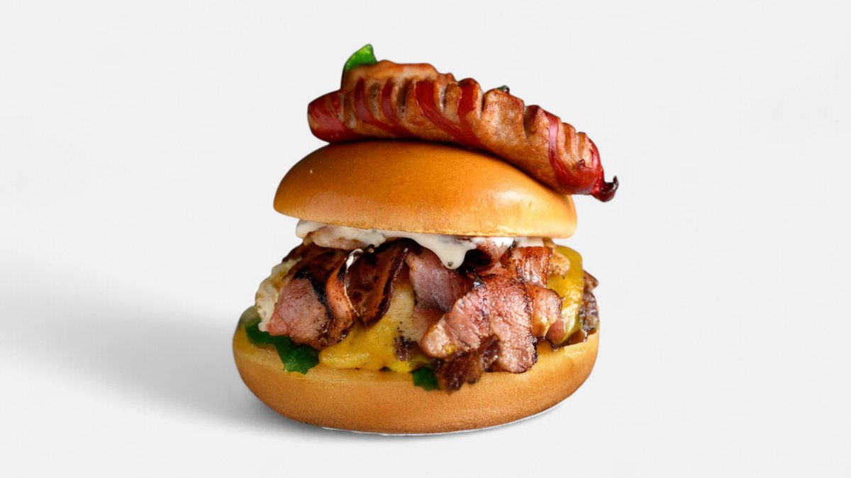 Two 130g pure beef homemade burgers, double cheese, double bacon, fried egg, tomatoes, lettuce, onions, gherkins and homemade mayo