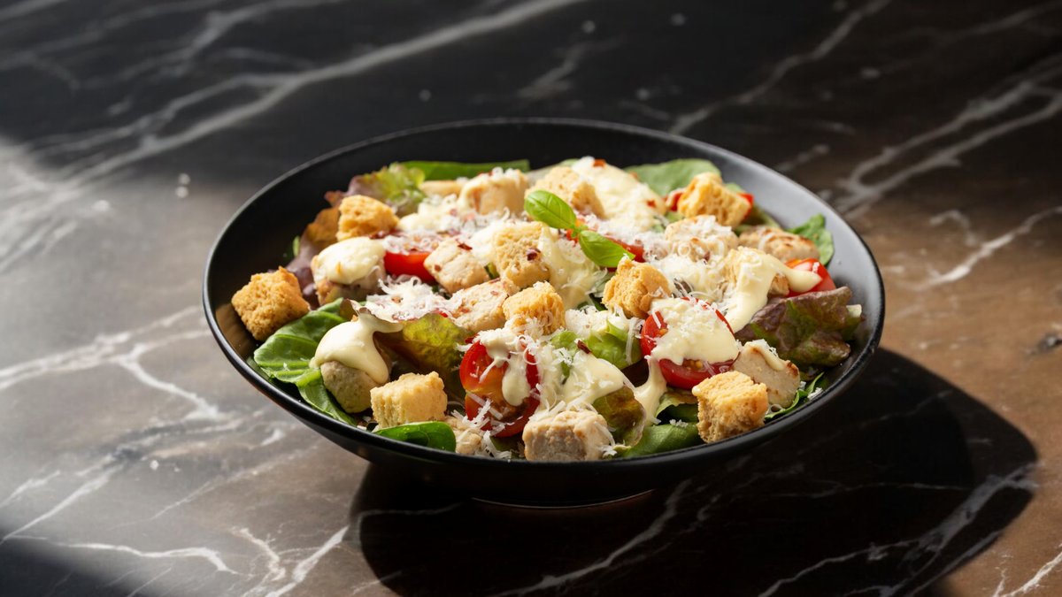 Homemade breaded chicken breast, rucola, tomato, parma ham, burrata and caeser dressing